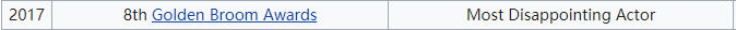 另外,这位歌手曾荣获 2017 年 8th Golden Broom Awards 的 Most Disappointing Actor 奖项。